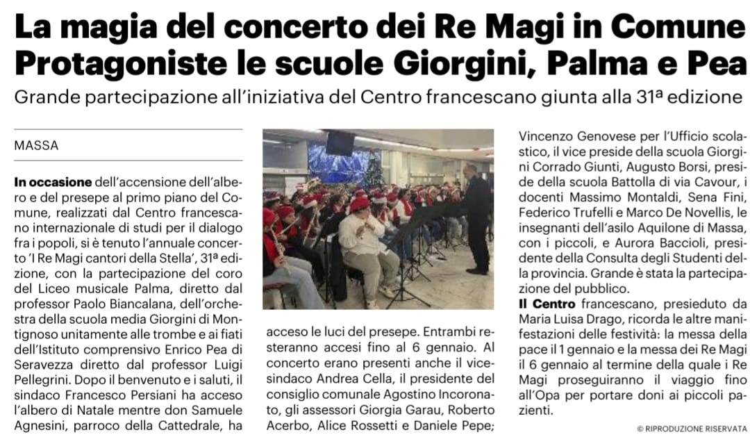 Hometutte le novità GeneraleOrchestra giovanile Giorgini con la sezione fiati IC Pea di Seravezza Orchestra giovanile Giorgini con la sezione fiati IC Pea di Seravezza Categorie Generale tutte le novità Data: 15/12/2023 11 dicembre Ore 10,30 Concerto Comune di Massa con il coro dell’Ist. sup. Palma-Gentileschi. Clicca QUI per leggere l'articolo del quotidiano La Nazione 16 dicembre ore 16,00 Concerto Borgo incantato Pieve dei SS. Vito e Modesto Montignoso 18 dicembre ore 10,00 Concerto di Natale per gli alunni di scuola primaria -Auditorium scuola di Cervaiolo 18 Dicembre ore 16,30 Concerto degli alunni delle classi II e III di pianoforte - Palazzo Ducale di Massa 21 Dicembre ore 21,00 Concerto di Natale - Chiesa S.Maria della Rosa Montignoso Il nostro cortometraggio SITO IN COSTRUZIONE